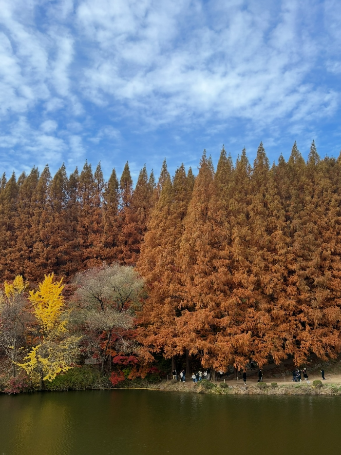 명수당 저수지와 함께 주황빛 메타세콰이어길이