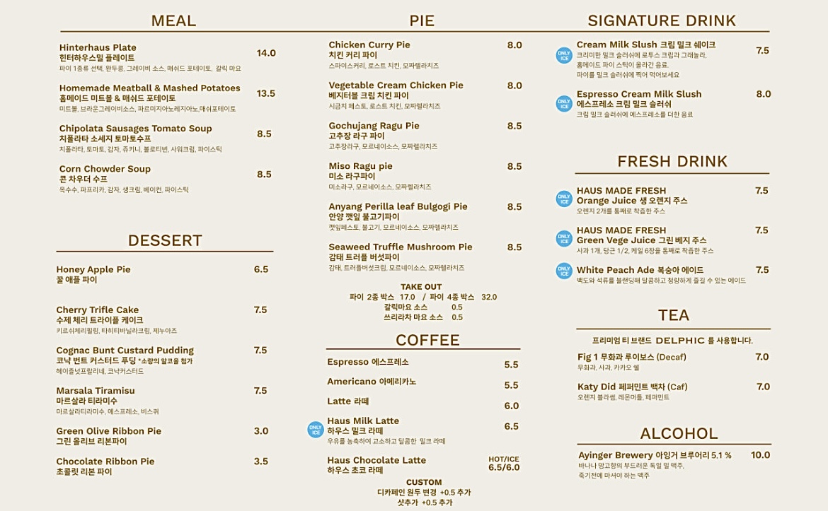 힌터하우스 메뉴입니다.