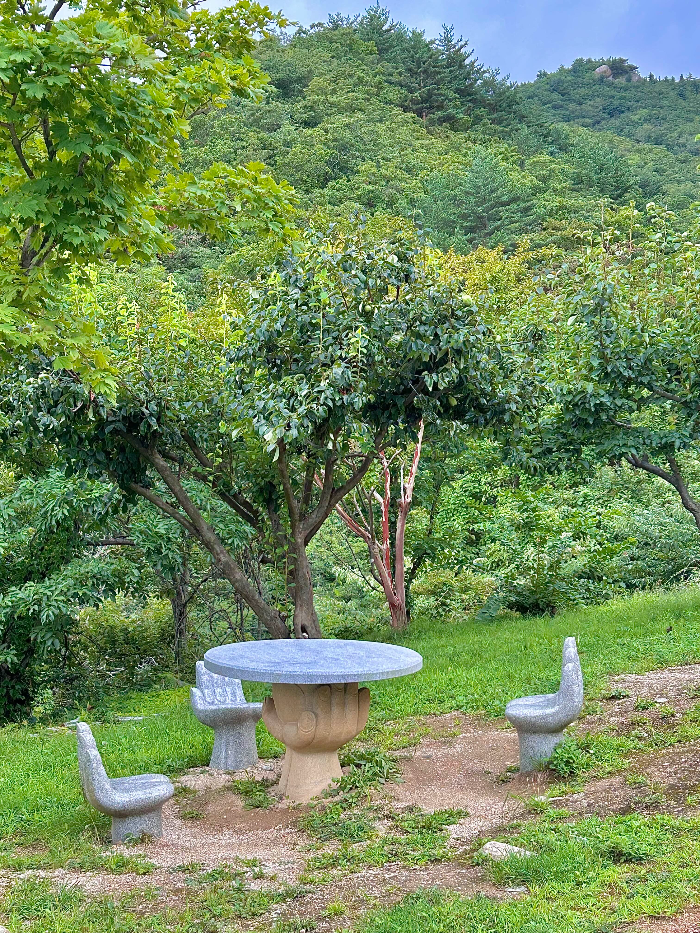 가는 길에 손바닥으로 조각한 의자와 테이블은